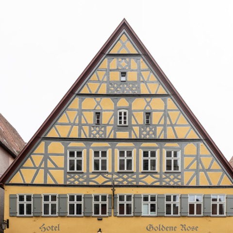 Passing through the second building, which is reserved for circulation areas and various service rooms, one enters house number three, which was also the location of the former 1870 ballroom. On the ground floor, hotel guests can have breakfast and dine in the Kantine Rosine restaurant. The ambience is enriched by wallpaper decorating the surrounding walls and ceilings, complimented by lightly transparent curtains for separate, quieter areas. The green inner courtyard offers a view of the cathedral, upper hotel floors, and the outdoor pool located on the top floor. The fourth building, a former residential building last used as a casino, houses a portion of the hotel's 43 rooms and closes the gap to the last building, formerly an inn and brewery, which houses externally designed flats, also part of the Goldene Rose.