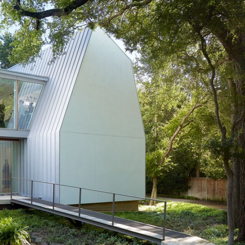 Upon retirement after 40 years of teaching Fibre-Arts and Interior Design at Texas State University (formerly Southwest Texas State University), the Lamans desired a gallery and studio to compliment their modest 1970’s era modern home, taken from Heritage Homes plan books originally started by Henry D. Norris AIA. Clad in white stucco, the 1800 sq. ft. residence is characterized by a tripartite plan arrangement of two shed roof’s flanking a central core.