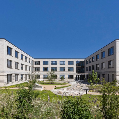 The simple U-shaped structure corresponds with a straightforward, rather plain façade design. The dominant design element of the façade is brick, for which a light, friendly colour tone was chosen that conveys lightness. The façade is divided into a plinth zone and the two-storey structure. While the superstructure shows a rather calm, smooth brick pattern, the ground floor has a concise but filigree structure of regularly projecting brick bands. The brick surface of the superstructure is proportioned by sparing details, such as the grouping of the office windows by setting off the intervening brickwork by means of recessed rows of bricks in the lintel and parapet area. The transition area above the ground floor is accentuated by a cornice band of natural stone that encompasses the entire building. A warm-toned shell limestone was used, which corresponds in colour with the brick used.