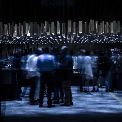 A rain of steel cables has 890 aluminum profiles suspended 2.4 meters from the ground. This aluminum carpet creates a new space inside the ship where daily welding, cutting, and mounting the projects of other professionals.The intervention is ephemeral but mutant. At the beginning of the act, the clarity of the day reveals the sculptural character of the scenery. During conference and catering, artificial light embellishes and enhances aluminum. Finally, at nightfall, LEDs inside each profile illuminate the cocktail and create a 1:1 scale catalog for the 200 guests.