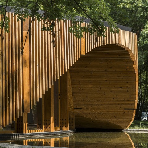 Set in the Tabolado Garden, in Chaves, the building with approximately 100 sqm, with a circular plan, is built using a structural base of timber pillars and beams over a concrete slab and is completely covered in timber battens. The circular timber building relates to its natural surroundings, bringing to its core concept the image that this region represents.