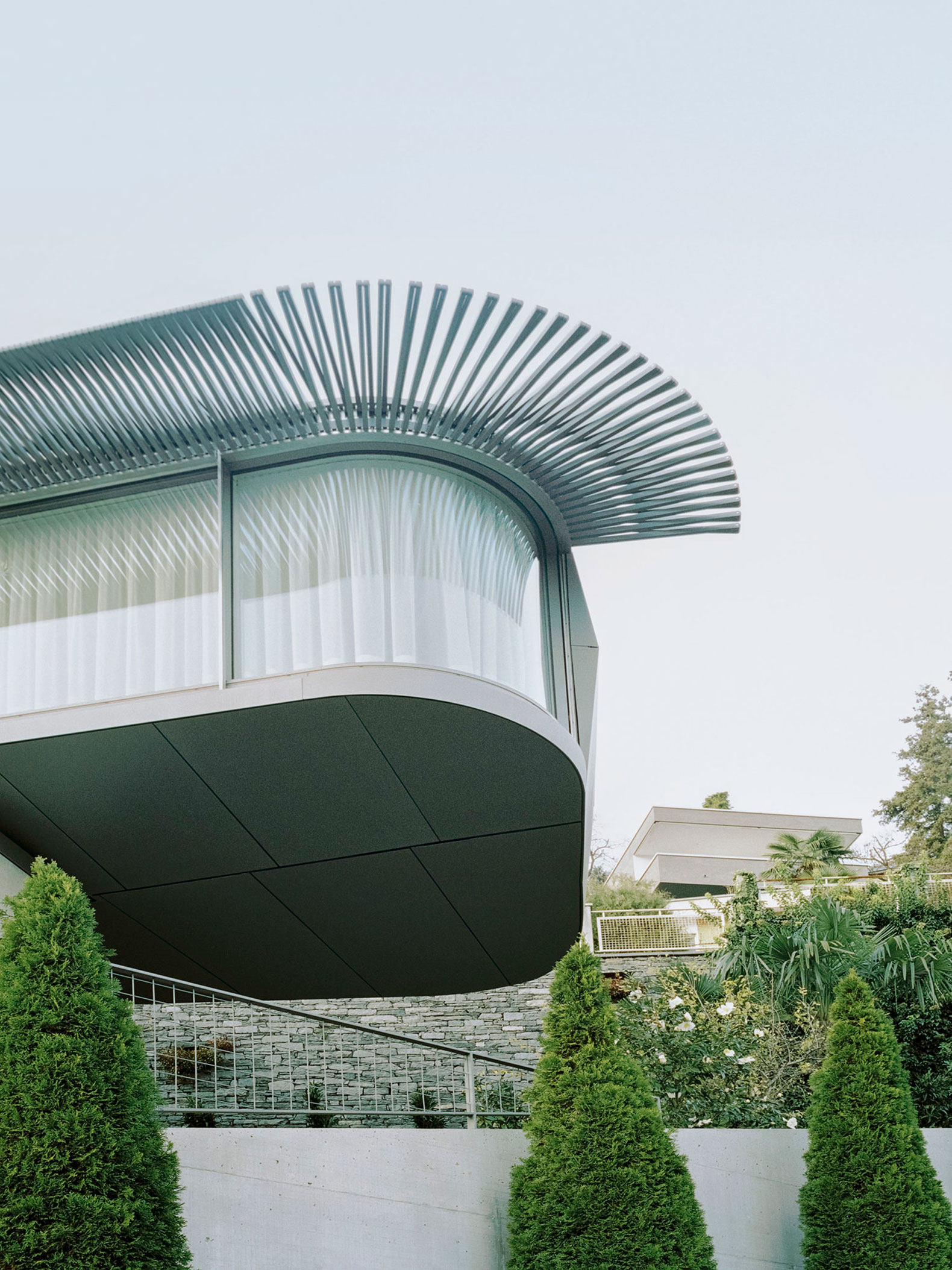 A second access takes place through the north staircase that leads directly to the garden. All the rooms face south and the large glass surfaces create a strong relationship with the surrounding landscape, the lake, and the mountains. The new volume stands out for its formal expression and the use of materials, deliberately different from the existing building, from which it departs to express its independence. The main axis of the building rests on the existing reinforced concrete wall, while the supporting iron structure is independent of the building below. The sun protection of the large glass surfaces is guaranteed by a motorized slat system.