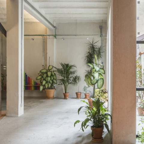 The site, an old garage located in the ground floor of an old housing block, owes its singular shape to 2 projects from the beginning of the 1950s. The first of them, at the front part of the plot and facing the street, is located under a residential building, where the original garage was placed, according to a project from 1947; it is built by means of an organised structure with load bearing walls parallel to the façade. The second one, at the back, is the result of an extension from 1952, when the old courtyard was almost fully built in and a new mezzanine level was added over it, to use it as a storehouse; in this area, the structure is much more disorganised, and it is built by means of pillars.