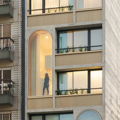 Due to the small size of the resulting flats, seeking a sensation of greater spatial amplitude, the elevations are completely free, interlacing the openings in elegant concrete arches that outline the façade and give a strong personality to the complex. The arches, present throughout the volume, add elegance while reinforcing the empathetic character of the whole.