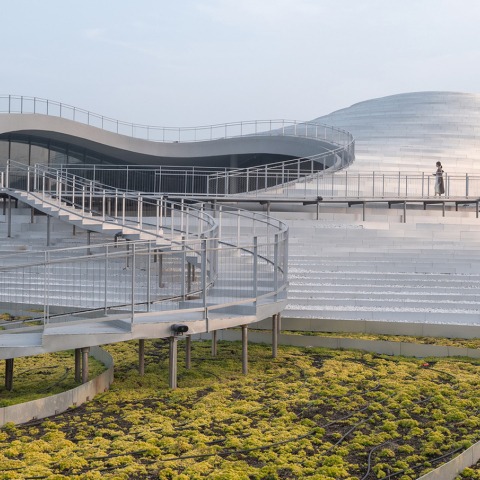 The undulating roof is formed by an abstract stepped terrace following topographic contours. The risers of the steps are lined using silver metallic surfaces, while the treads are covered with white stones and low vegetation, traversed by winding planked walking paths.