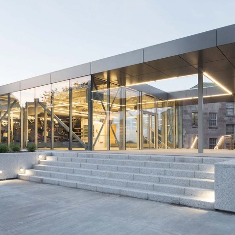 The generators are installed in a glass pavilion sitting on a granite baseboard at Dr. Penfield Street level while there is storage space for campus street furniture on the lower level. The interstitial space between these two volumes serves as a plenum for air, steam, and electricity connected to the Ferrier power station. An open staircase opens a new passage along the east-west axis to connect the top and bottom of the campus.