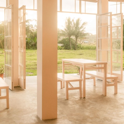 All furniture is made of plywood by local carpenters while the bespoke woven seating-covers is made of Pandan, a grass grown, dried, dyed and woven by a local collective of weavers. Native Narrative wished not only to celebrate native produce but also to raise the status of native woven products in an area where imported foreign products is often preferred over locally produced craft.