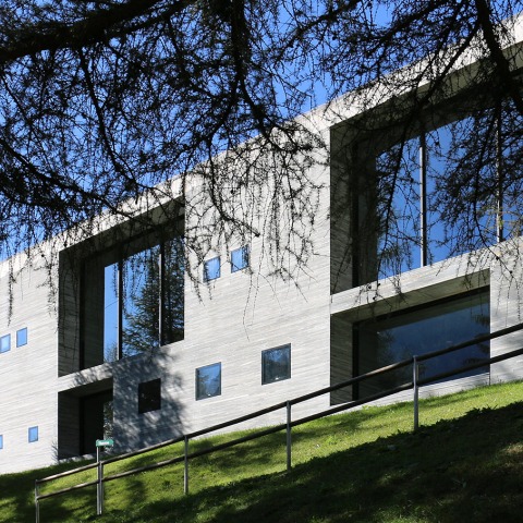 The structure of the project is formed from load supports formed by solid concrete walls and thin slabs of Vals gneiss, a stone from the local Quarzite Valser quarry. The volume is designed resting partially inside the hillside, as if it was a stone from nature. Due to the monolithic nature of the bathroom houses, the building is heated by thermal mass.