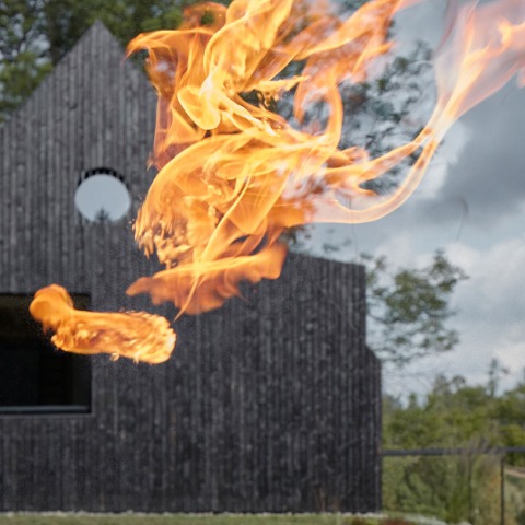 Above the valley of Horská Kamenice river fallen beeches rustle and the wind plays a strange melody. White smoke rises from the black house and suggests that the cottage is not empty. The original face of the unfinished cottage from the eighties has changed beyond recognition. The gray brizolite was replaced by black wood paneling, which the owners tanned themselves. The wood also extends to the roof areas and the main house, even with a small cottage, looks very abstract. Terms such as roof, wall or chimney merge into a single shape. There is a house with windows and a terrace. Some of the windows cut the facade cladding into a round shape. The house looks like an overgrown birdhouse.