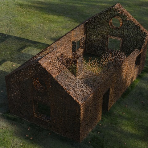 The work presents a house covered in sprawling ivies. A symbol of hearth and home, this house, as detached, leaves a space formed by the wrapping creepers. It is the remembrance of a vanished living space and thus of the people and things of the past. "The Vanished House" is a memorial space that invites visitors to participate in and experience.