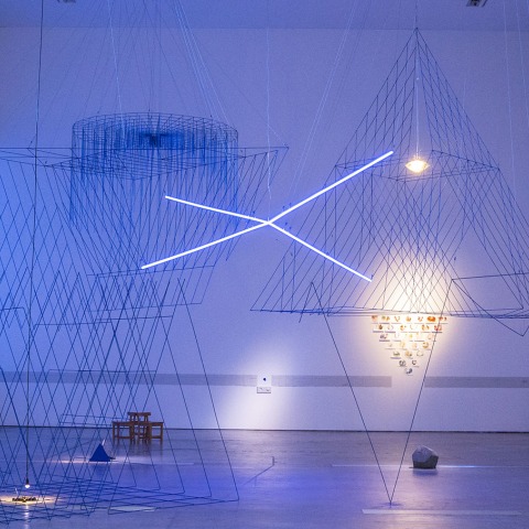 Hand-painted in cobalt blue, the 3-dimensional drawing or sculpture will be suspended from the ceiling of the main gallery, spanning 29m x 16m x 11m high, which corresponds to the proportions of an A4 paper sheet. The sculpture is artificially lit by ‘These islands’, a diptych of films recorded on Achill Island in 2013 and at Ballysadare Quarry in 2017.