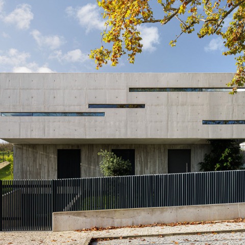 Urban and landscape integration is ensured, as the materiality of the facades leaves the volume sober and camouflaged in the terrain. As this is a terrain with a steep slope, it was possible to let the volume function in two overlapping layers, one that serves as a base and that is embedded in the terrain and another that levitates over the first, represented by a white element, and where develops the social part of the house.