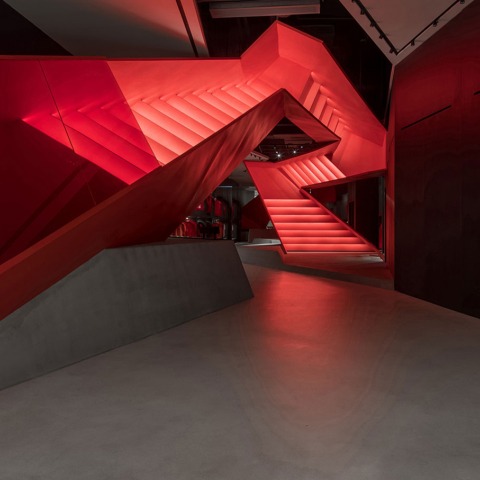 A very futuristic geometric sense of the interior filled with red and black hitting the tone, red symbolizes passion and explosive while black is distributed calmand restrained gas field. The perceptual blood grows in the rational enclosure, and the two colors are balanced in confrontation.