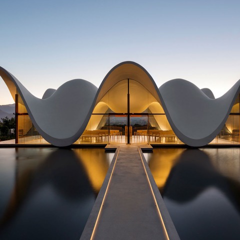 This translated into the sculptural form which emulates the surrounding mountains as well as the poetic motion sought. This lightness & motion is further emphasised by means of a strategically placed reflection pond. The form is further refined by means of the interpretation of the baroque ‘holbol’ gable in the edge profile and the roof shape. The main characteristic of a ‘holbol’ gable is that of the combination of outward in inward curvatures which results in a series of ‘peaks’ and ‘valleys’ within the roof itself. Similar to the Mission Churches it has no vertical elements and the form is generally horizontal. As with the gables present on these churches, the identifying element on the Chapel is that of its roof and its shaped edges.