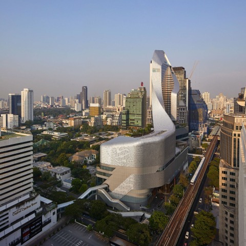 The tower designed by AL_A, is located within the former gardens of the british embassy on Bangkok’s Ploenchit road, the 1.5 million square foot project features a seven-floor retail podium with a 27-storey high-rise hotel. The two elements are brought together with a looped form that combines the plinth and tower as one sinuous structure. Amanda Levete's design seeks to unite traditional craftsmanship with digital design technologie.