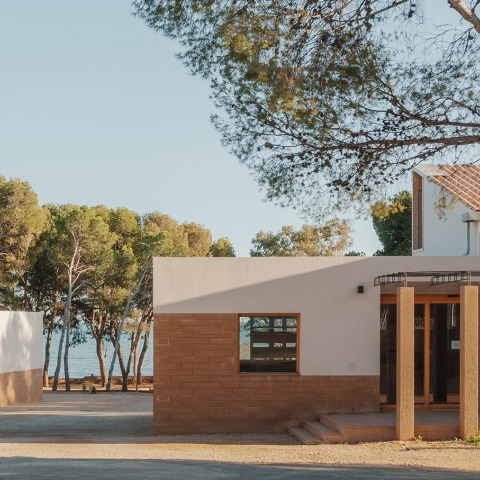 The gradual transformation of this campsite begins with a new street that opens towards the sea, continuing a sinuous downward journey. In this place, two new central buildings are anchored on walls that stagger terraces for campers, some pre-existing and others added. One of the buildings (reception and shop) faces the access, the other (restaurant) unfolds towards the shore. The steps and walls, which sometimes expand to contain small auxiliary pavilions, have been built using prefabricated walls, local “Sènia” stone and concrete eroded by water. This type of artificial topographies appears as an infrastructure that suggests a slow future—works fragmented over years so as not to interfere with the campsite's operations—while embracing old shady pine forests, aromatic gardens inhabited by native plant communities, a multiplicity of pergolas, breathable reeds and vines, clusters of wooden cabins (24 new bungalows), and a wide variety of places for summer delight; whether dining on stone carpets, enjoying the breeze with feet buried in sand or diving in a pool embedded in a cove in front of the sea—places, all of them non-natural, half-found and (re)constructed by this project.