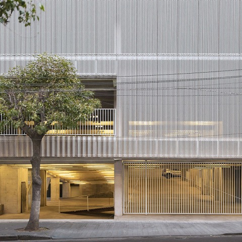 The concrete structure of the complex manages to give it character thanks to the clean geometry with which it rises and is arranged as a field of screened pillars that support a series of thin beams on which continuous slabs are folded to accommodate the parking. This entire exposed concrete structure is elegantly covered with a light veil of white lightweight metal.