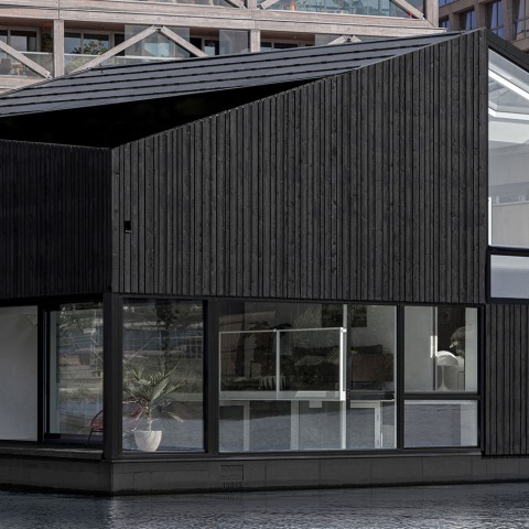 To i29 architects, architecture and interior designs are always intertwined and connected on each level to make a clear and unified experience. The floating home exterior design is the result of a space extensional study within the interior and vice versa. All areas are in open connection to the atrium which comprises three floors. The layout is extended with a split level connection to a loggia terrace just above water level. The interior and facade play with the views on the outside. Views appear and disappear while moving through the home. The basement offers direct water level views, the living room only gives a view on the surroundings when sitting in the lounge and the kitchen on the top floor has directed views towards the south and north side of the canal. On the top floor, a cut out of the roof enables a loggia and open terrace with a view towards the harbor in the west .