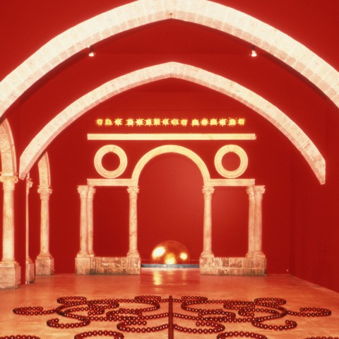 The Door of Innocence (1986-89) is a gilded marble sculpture in the shape of a ring and evokes a moment of passage and transformation, through which metaphysical and abstract concepts acquire physicality and concreteness in the artwork. While in The Tomb of James Lee Byars (1986), the artist metaphorically encloses in a sandstone sphere the intangible and absolute concepts of spirituality and purity, which are in contrast with the porous and layered material. The Cubo space at the end of the exhibition display is dedicated to Red Angel of Marseille (1993): a thousand red glass spheres arranged on the floor create a sumptuous anthropomorphic and, at the same time, floral form. The work reduces the human figure to its essence, while the angelic connotation, suggested by the title, opens again to a reflection on human metaphysical potential and relationship with the divine.