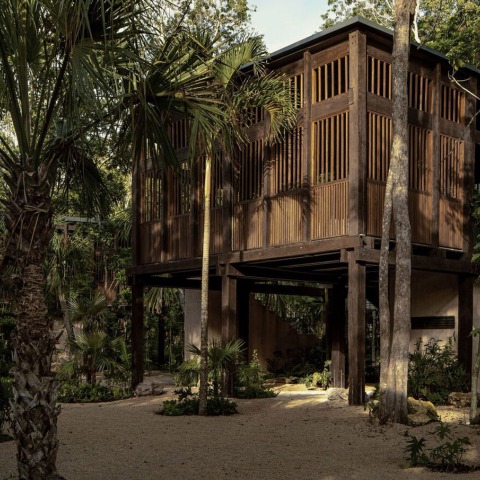 The dark-colored local Chicozapote wood, sourced from an FSC-certified forest logging program, creates a rhythm across the facades, which is punctuated by vertical window mullions and slatted railings. The units are designed to age naturally over time with a breezy wooden pavilion structure suspended on stilts, to reduce the environmental impact and to raise visitors into the jungle landscape.