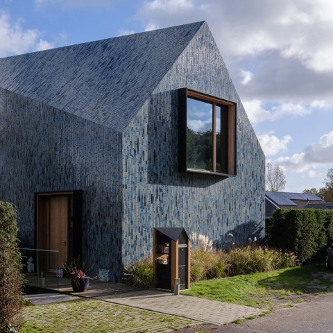 The multi-colored glazed tile cladding represents the transitions of the landscape from dunes to polder, the change in color of the soil layers from light to dark, and the evolution of the different seasons. The interplay of the different color tones provides a varied, multicolored, and natural façade and roof, the result is a unique and striking house.