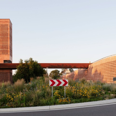 The use of durable, robust materials such as rammed earth and Corten steel creates conditions synonymous with an ensemble designed for the future. Defining elements include the perforated facades, uniformly made of sedimentary layers of red-tinted rammed earth, which are inspired by the traditional use of red sandstone in this region and the former riverbank of the Rhine. This construction method is simple and craftsmanship-oriented, including layer-by-layer compaction of a moist mixture. Similar to the formation of natural sedimentary layers, this creates a versatile facade pattern that emphasizes the buildings’ simple and robust character.