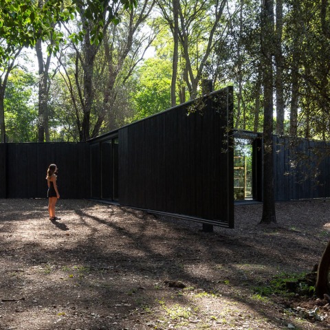 The main characteristic of the space is the possibility of opening or closing it completely, thanks to a series of three nine-meter sliding walls that connect or separate it from the surrounding landscape, reconfiguring the immediate environment according to the needs of the moment. Sometimes it functions as a small, blind, anonymous space. At other times, its sliding surfaces move and embed themselves among the trees, inviting one to cross them in all directions, allowing the visual to pass through and integrate with the surroundings.