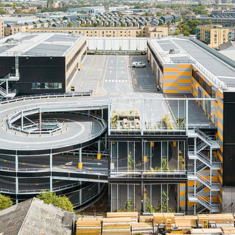 Haworth Tompkins worked with the branding agency DNCO to design graphically bold elevations that reflect the building’s industrial function. Finding inspiration from graphic patterns and colors found in manufacturing settings, DNCO’s close collaboration with the architect resulted in a bespoke color scheme, wayfinding signage, and branding throughout the building. The corrugated metal paneling of the interior deck façades features a playful silver and yellow checkerboard pattern, inspired by the building’s helical vehicle ramp logo.