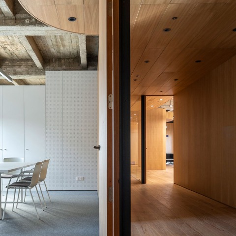 The solution adopted meets the functional needs of the Port Authority by means of a sinuous geometry that resorts to a more generous redistribution of the space through curved arrangements, which favours a more fluid, changing, less predictable space, within a tremendously rigid original configuration. On the other hand, it also seeks to make invisible the awkward distribution of pillars in the floor plan, whose layout - complex, as it suffocates the space for the dimensions intended - exclusively serves the configuration of the main staircase on the lower floors. Along the central body, a sort of alba substance extends, in this case woody, which, at the mercy of the existing pillars, decompresses the space and facilitates the relationship between the users of the east and west wings of the building, which were previously disconnected. This configuration also makes it possible to house the rest of the common areas, such as an office, new toilets, a training room and a multi-purpose space that is transformed by means of a mobile partition wall, directly linked to the terrace, facing the quay.
