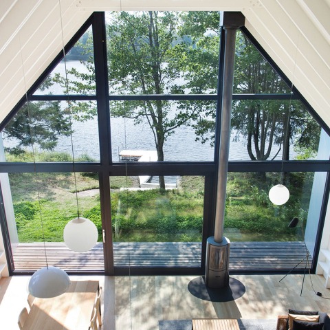 Both of the building’s long sides feature three large, tall glass panels, allowing seamless transitions between interior and exterior spaces. The south side is all glass, creating a direct link between the lake and the living spaces, arranged under a large double-height gable extending outward to cover a small porch.