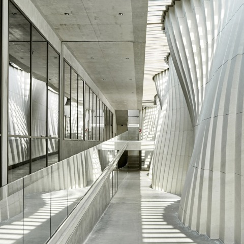 Using solid, structural stone, the new wine cellar and shop become walls framing a renovated manor house and its garden. The stone relates to the site, while the thermally inert, porous walls create ideal conditions for wine. Ramps within the winery allow visitors to discover the wine process within an efficient interior and lead to views of the hills from a roof terrace, and down to the bottle cellar under the manor house. Sunlight enters the visitors’ gallery through a continuous skylight, the undulating wall serving as a light reflector for the tank and barrel halls, where direct light would be detrimental.
