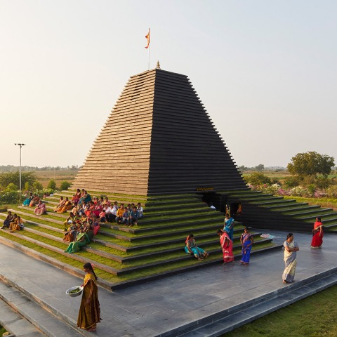 The construction process uses locally available black limestone slabs corbelled to form the main body of the temple. The same corbelled profile also incorporates soil and planting in the lower half of the temple body to buffer against the heat and finally this stone corbelling turns into a ghat i.e the steps that access the water.