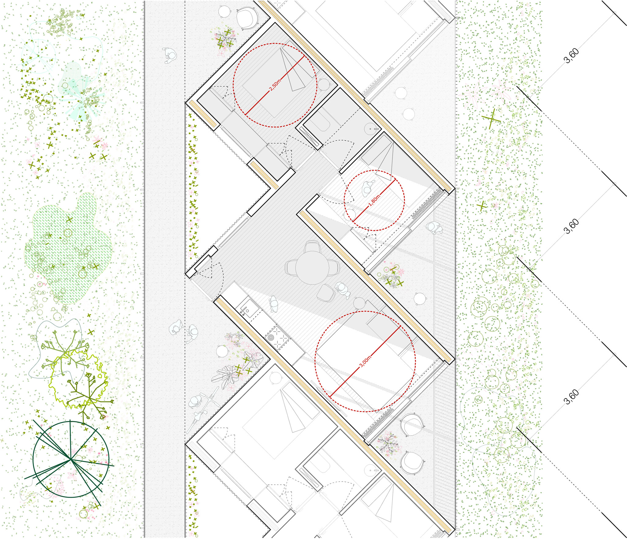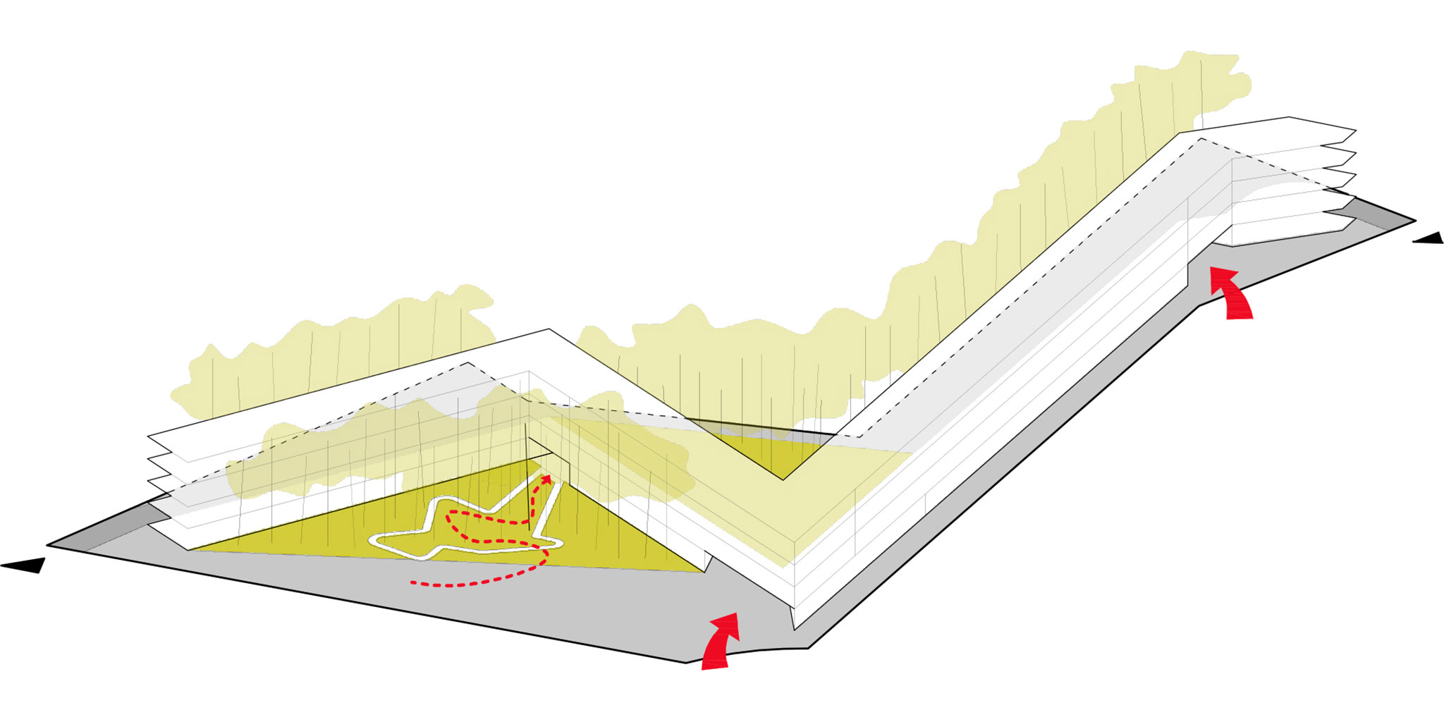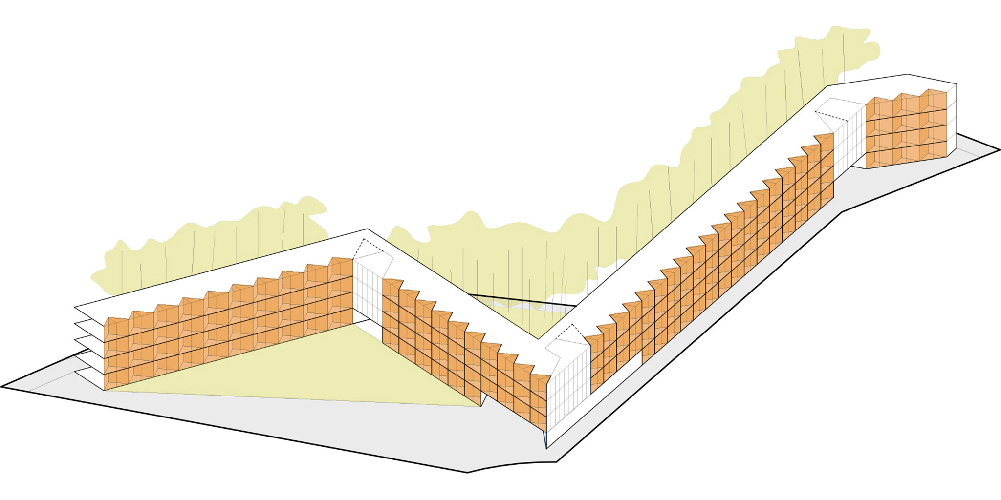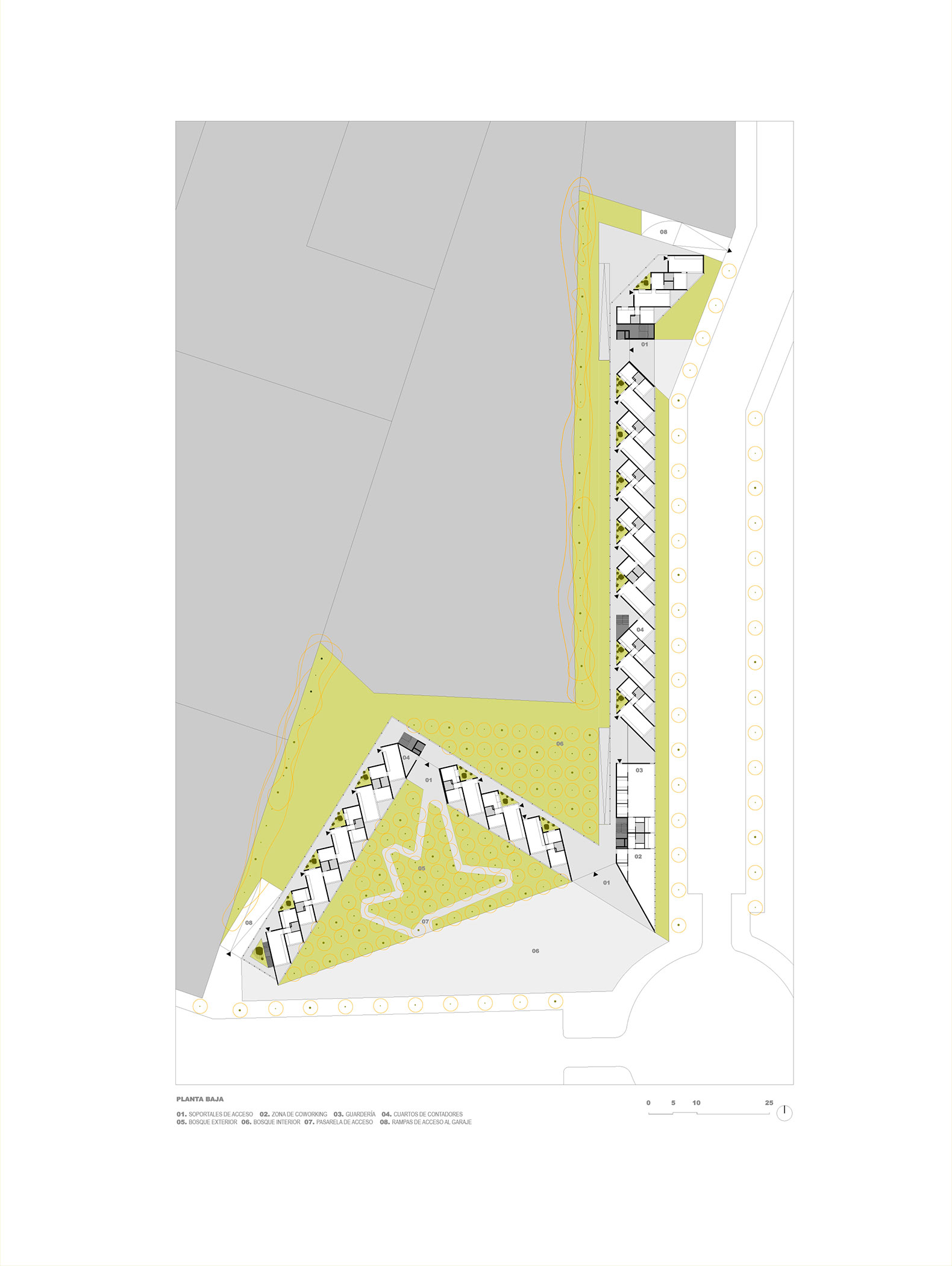 The project is situated within a complex urban environment, on the boundary between the newly created residential city and the industrial fabric undergoing relocation. This border condition is embraced not as a problem, but as an opportunity to activate new spatial, social, and ecological relationships. The building is conceived as an articulated line, a zigzag that adapts to the irregular perimeter of the plot and, as it folds, generates a sequence of public and community spaces of varying sizes and intensities. Unlike the closed and homogeneous urban logic that has characterized many recent residential developments in the area, where the plot boundary is nothing more than a "fence" of privacy, this proposal seeks to construct an architecture open to the complexity of the site, capable of embracing the unexpected and fostering collective life.