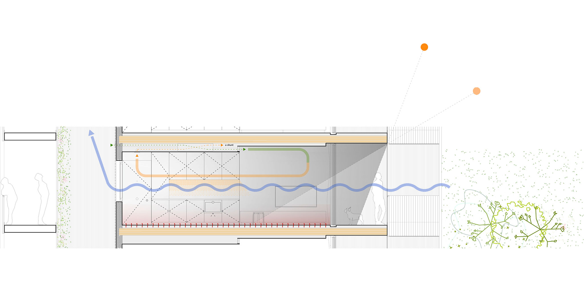 In terms of construction, the building consists of a concrete foundation for the basement and a lightweight cross-laminated timber (CLT) structure, organized using a modular system of five types of load-bearing walls. Energy efficiency is guaranteed by a 25 cm envelope finished in micro-perforated mini-corrugated sheet metal —in homage to the area's industrial past— and by a green roof that acts as a natural thermal regulator.
