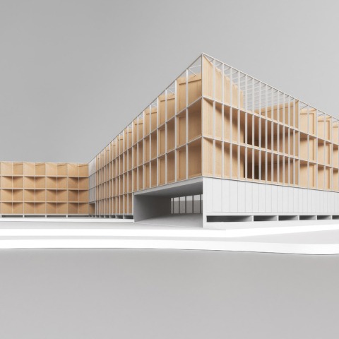 The project stems from a key construction decision: to reduce the building's carbon footprint through a prefabricated cross-laminated timber (CLT) structural system. This choice is not solely based on technical criteria but constitutes a central idea of the project, articulating sustainability, efficiency, and architectural quality. The building is conceived as a lightweight and precise infrastructure, capable of rapid construction, minimizing waste, and fostering a healthy and adaptable environment. Based on this premise, the complex is organized as a dual tectonic composition: a permeable, thermally inert base anchored to the ground, upon which rises a prefabricated, lightweight, dry, and modular timber structure. This duality not only optimizes the construction processes but also architecturally expresses the relationship between the building, the ground, and the urban landscape.