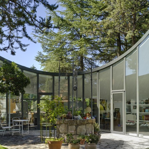 The final reappropriation occurs with the adaptation of the place to resolve the request. the immediate surroundings are not modified or altered toponymy of the place, on the contrary, pre-existing conditions are accepted as guidelines path (the curve of the glass facade is the same as before marking a step on the stone pavement to keep). On the old platform perched object one progresses in flight over the vacuum produced by the uneven terrain appears. The lower ground level is lowered slightly to, with the help of a new enclosure wall, build a porch and outside the scope of the stone platform is now, both exterior and interior. The upper floor of the house occupies the new building volume through a prefabricated system based wood paneling counter-laminated spruce, cut in workshop and assembled on site on a new metal structure that does not interfere structurally with the existing composite stone, brick and concrete. Forms a large open space that functions as stay (living-dining-kitchen), communicating with the common house garden farm. The lower floor partially buried, welcomes stays privacy and seclusion, fragmented open spaces to an English courtyard and an `ex-novo', artificial garden in contrast to the large existing garden.