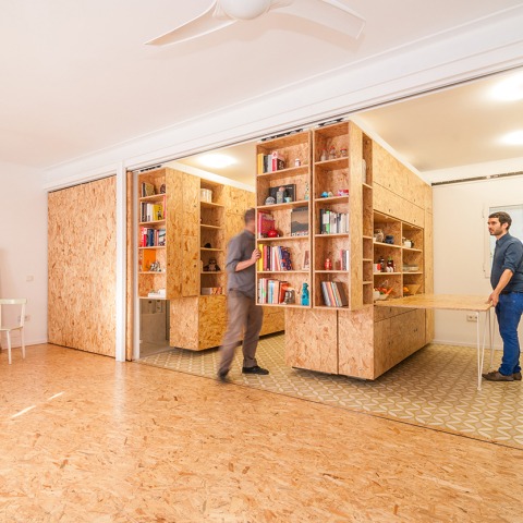 Through a carefully made design, totally custom-made, and the combination of carpentry and the use of quite a simple industrial railing system, all the server space in the house is arranged through three wooden, suspended, mobile and transformable containers. This server space can be totally re arranged in just a few seconds, thus allowing, in a variety of combinations with served space, to adapt the whole house according to specific needs for the use of space at the time, enabling infinite homes within a house.