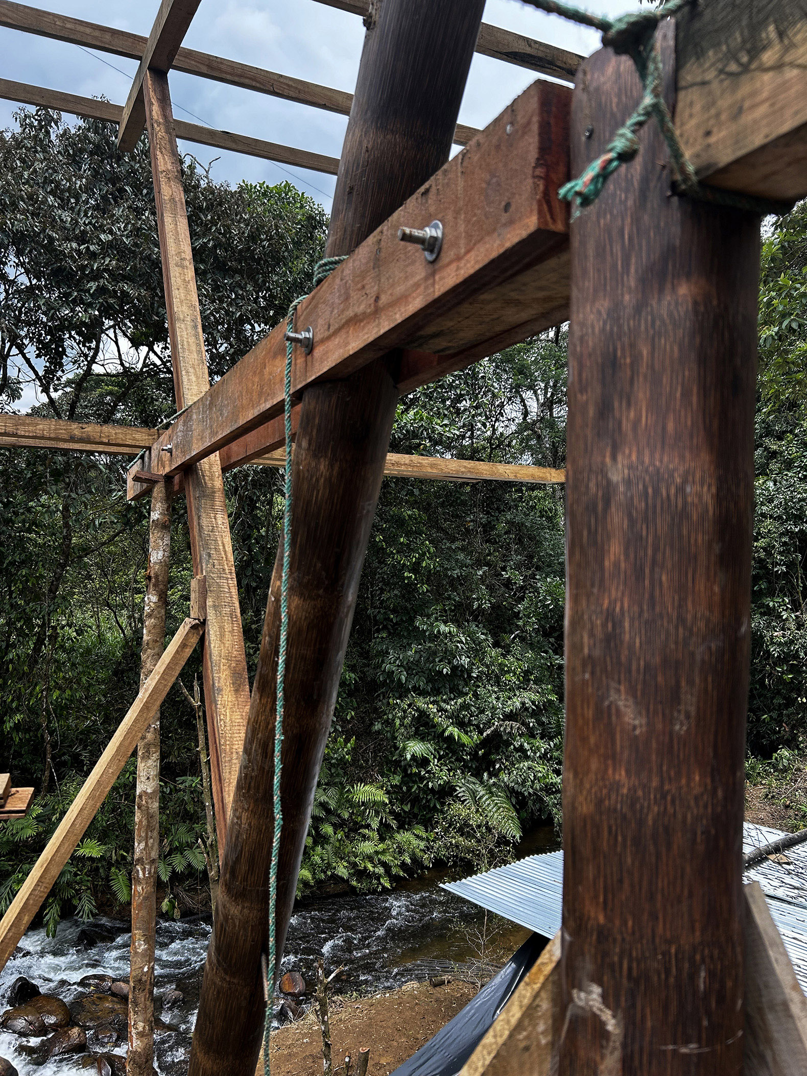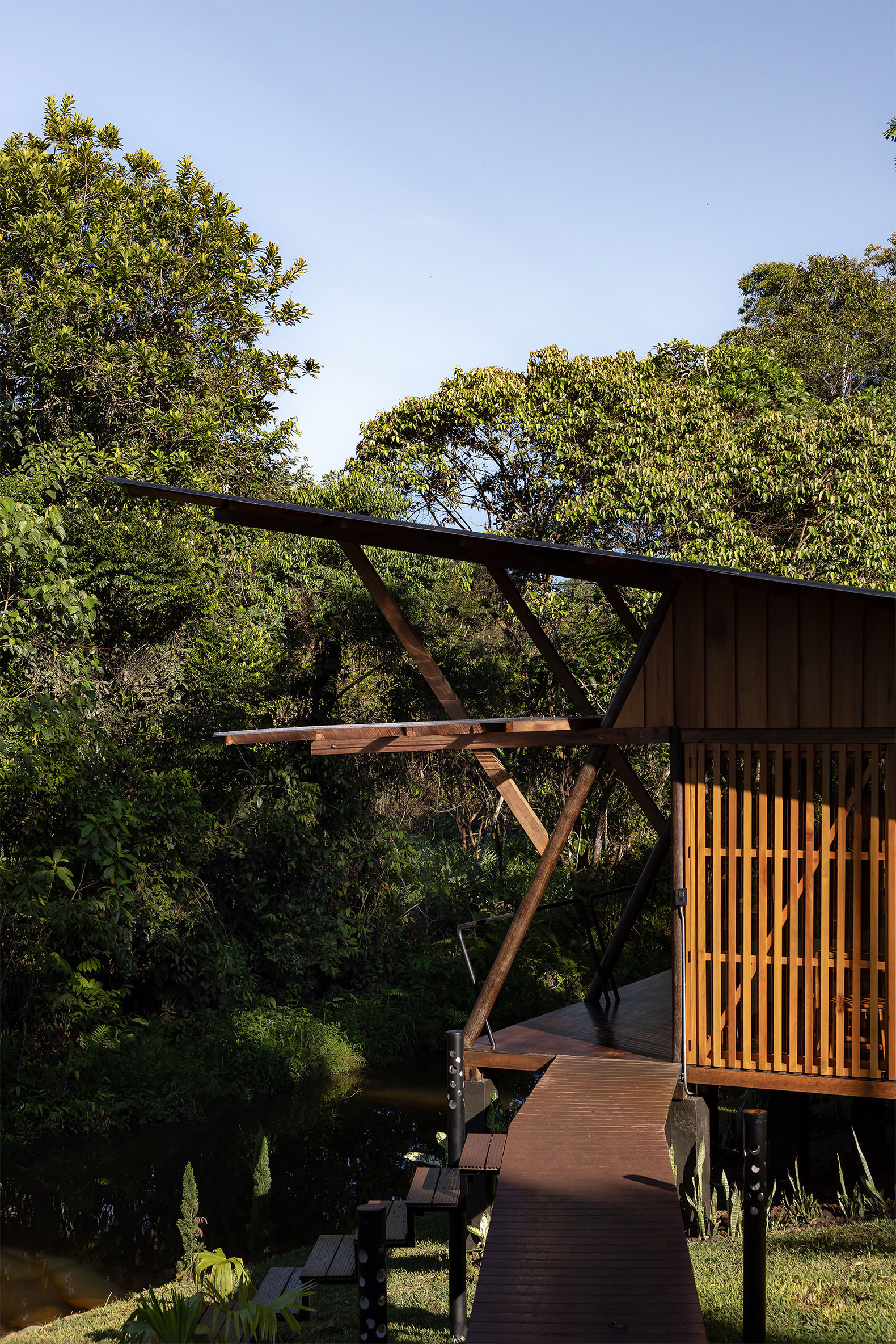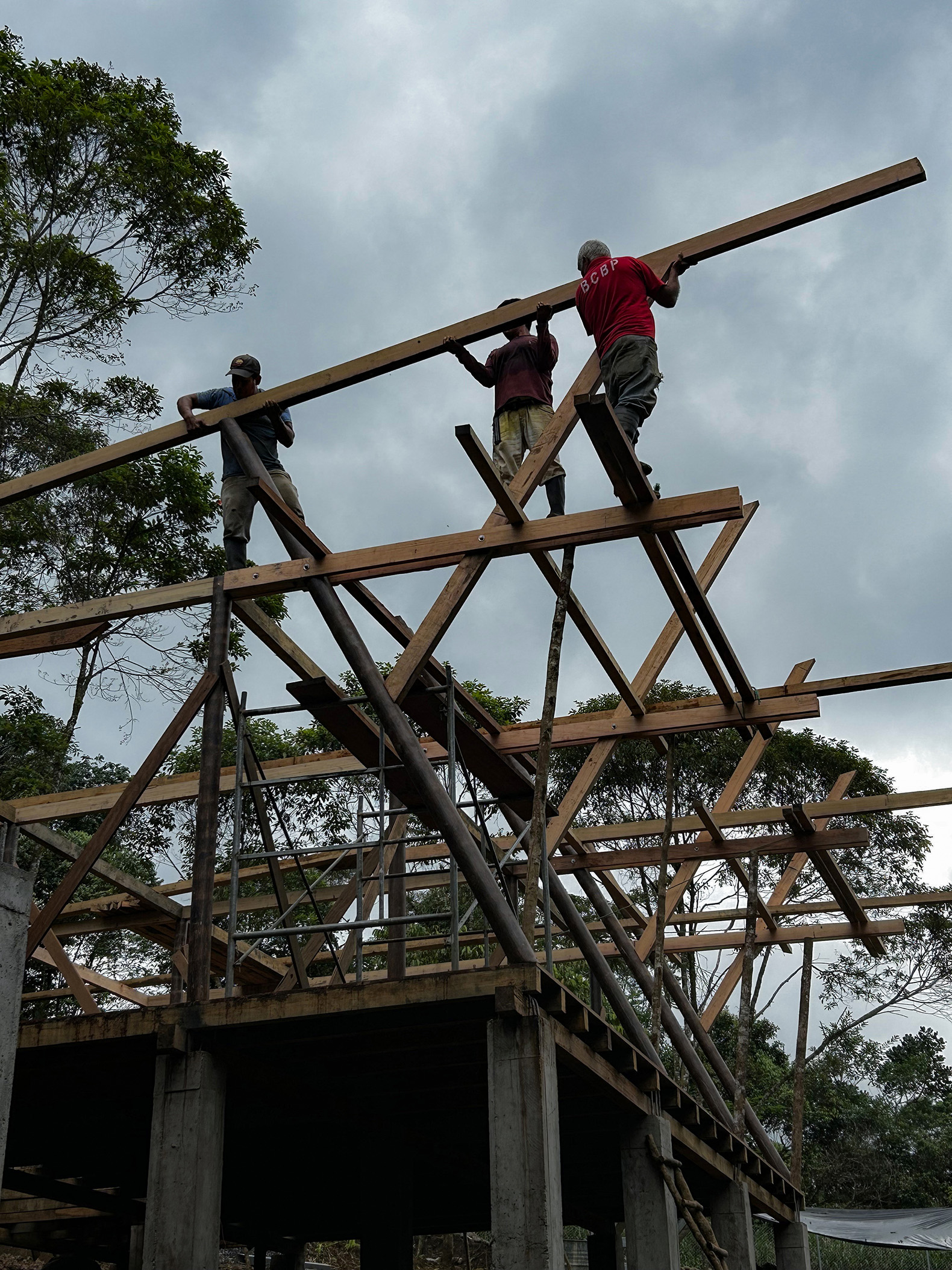 Known by local communities as the "steel of the jungle," the "Killi," a palm species commonly found in these territories, has been used for centuries in vernacular constructions in the Amazonian rural landscape. It is a slender, durable species, resistant to direct contact with damp soil. Existing Killi trunks found on the site were collected and taken to a carpentry workshop, where they were treated and later returned to their original location, this time as structural elements. Combined with wooden beams sourced from local communities, they form a series of triangulated frames that define the architectural structure.