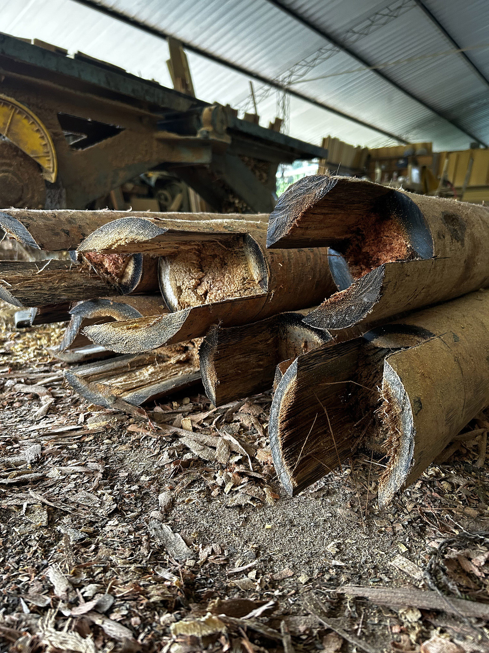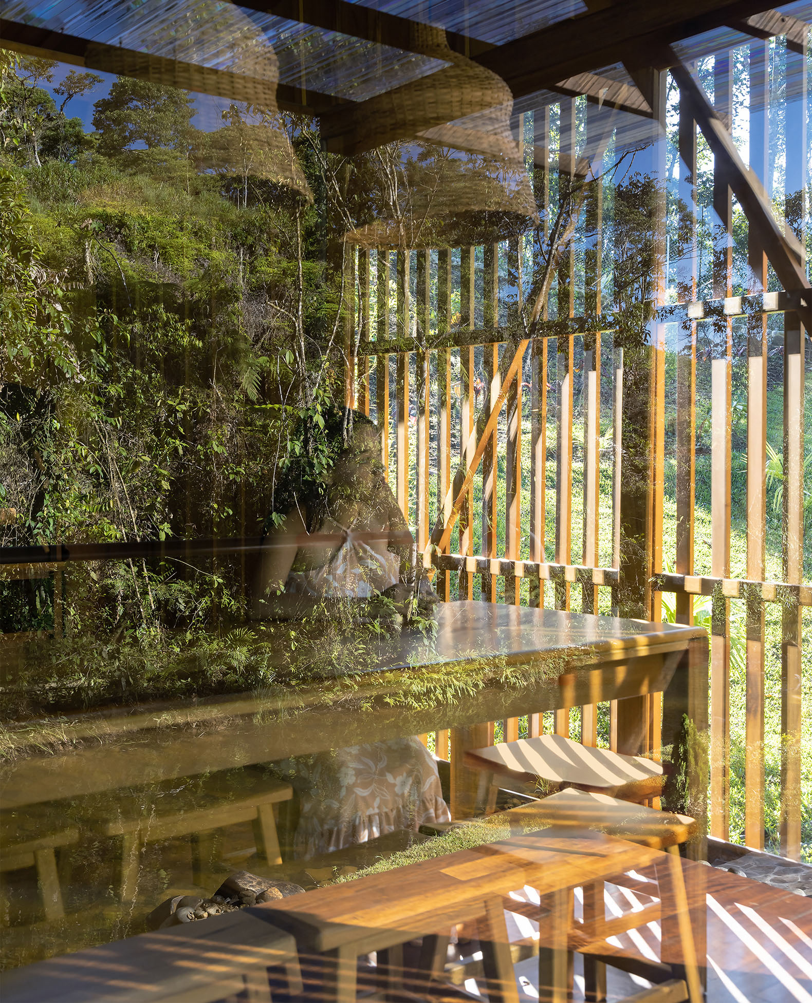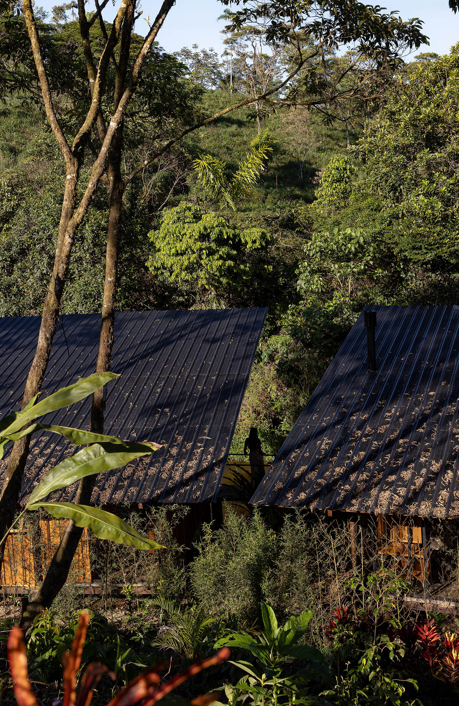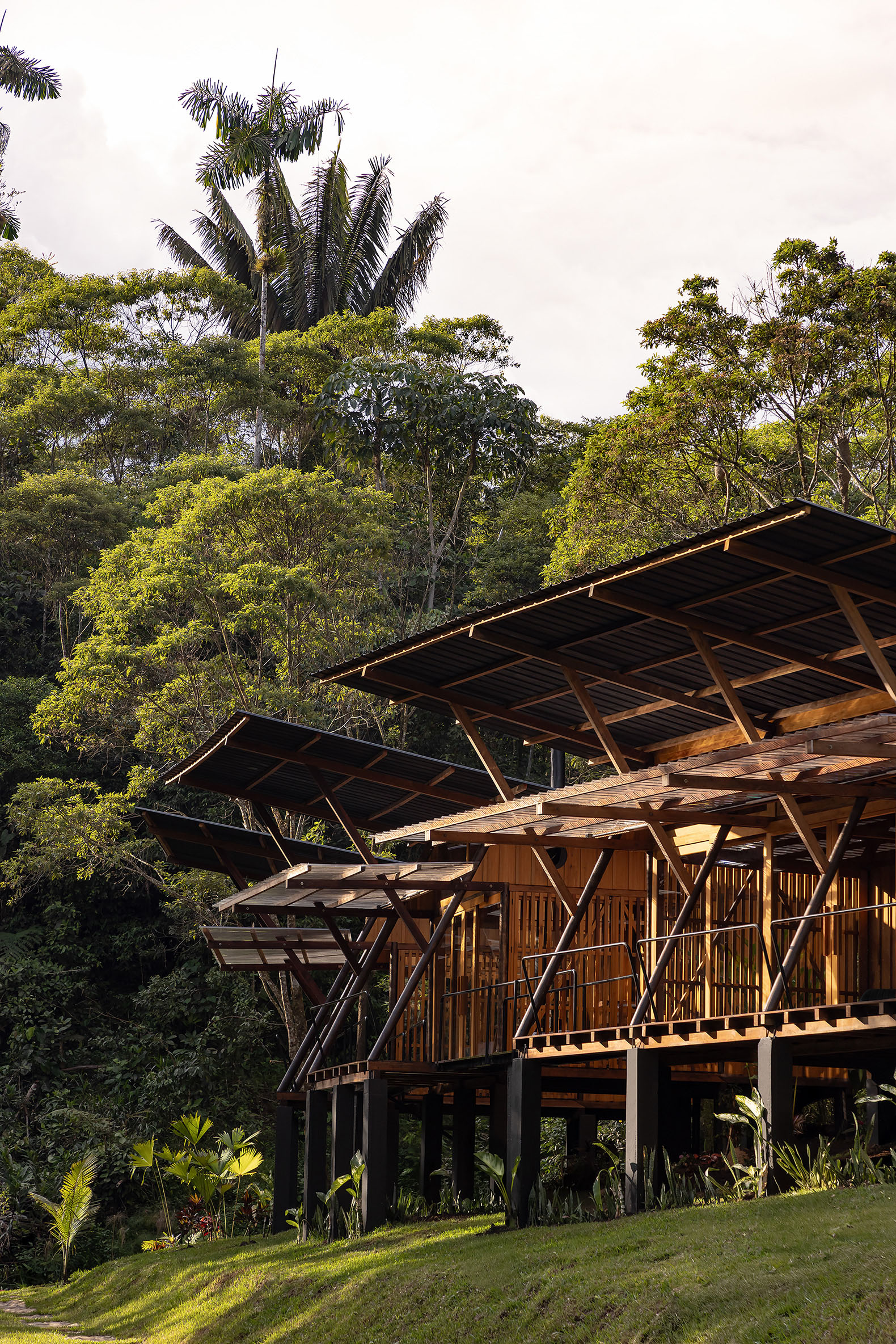 Known by local communities as the "steel of the jungle," the "Killi," a palm species commonly found in these territories, has been used for centuries in vernacular constructions in the Amazonian rural landscape. It is a slender, durable species, resistant to direct contact with damp soil. Existing Killi trunks found on the site were collected and taken to a carpentry workshop, where they were treated and later returned to their original location, this time as structural elements. Combined with wooden beams sourced from local communities, they form a series of triangulated frames that define the architectural structure.