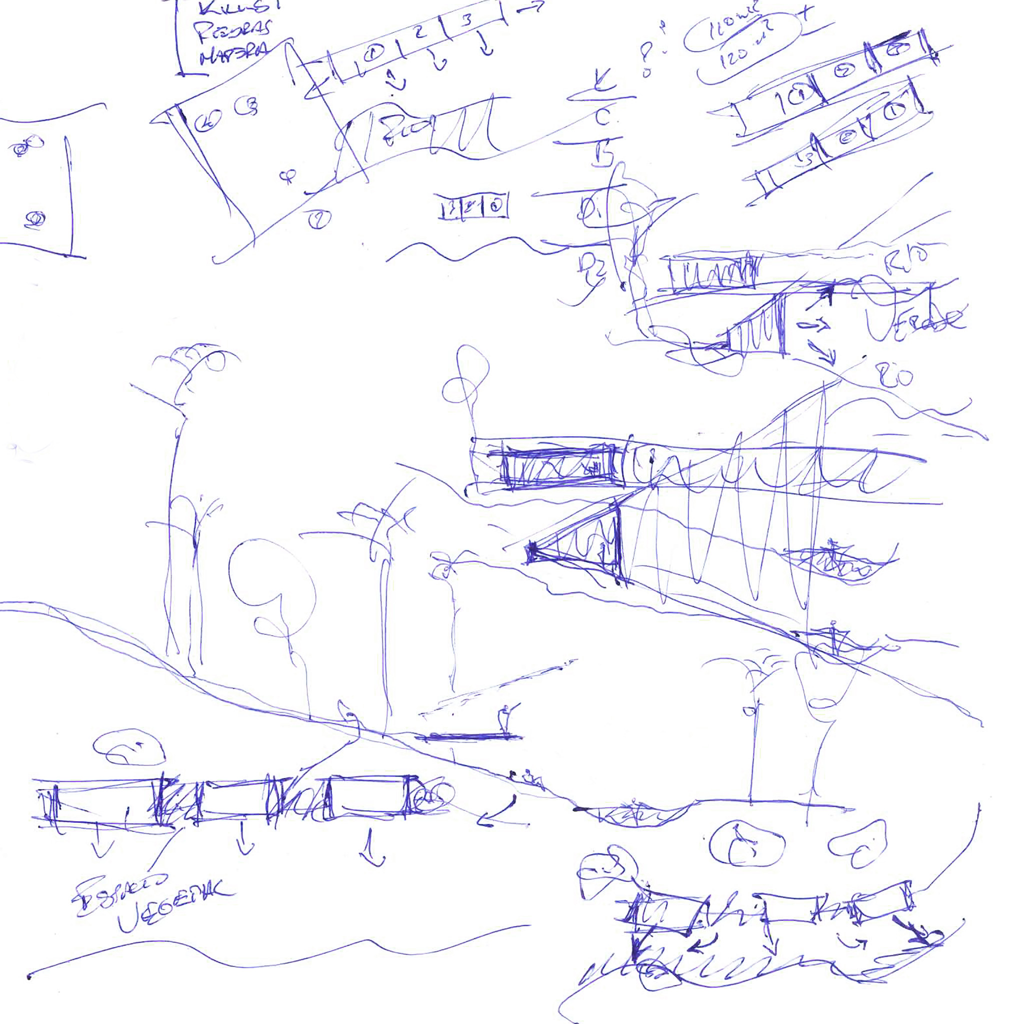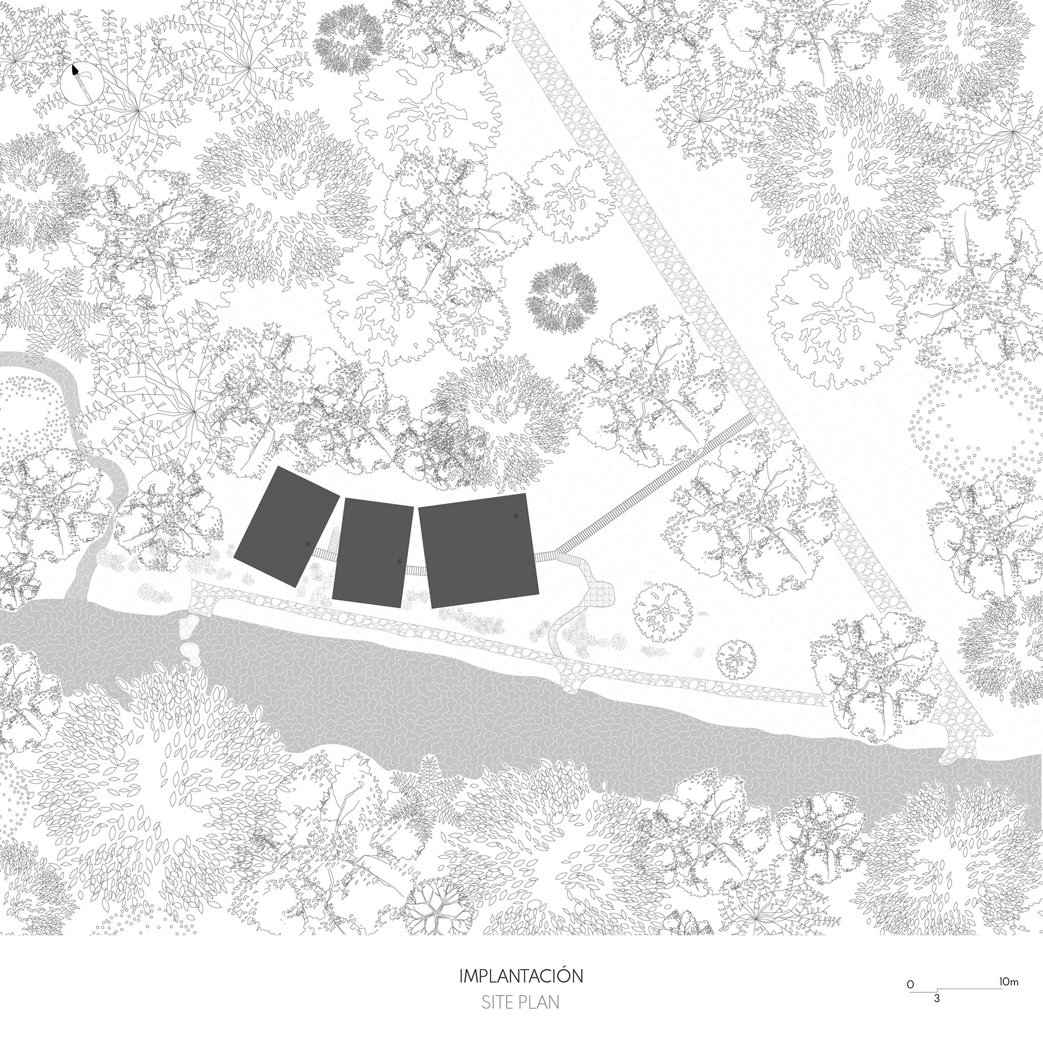 Through an elevated walkway running parallel to the riverbed, three wooden modules are articulated, using voids as a strategy for privacy. The lateral modules are rotated in relation to the central module, generating the required intimacy while simultaneously fostering direct relationships and experiences with the surrounding natural environment, without losing internal connection among its inhabitants.