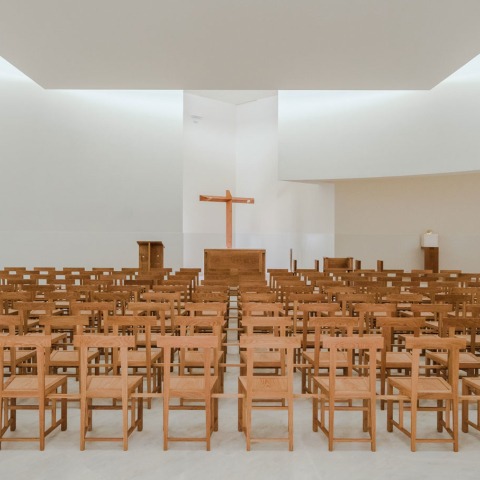 The central part of the church has seating for 126, with access tor the disabled. A side chapel to the south contains the baptismal font, a semicircular apse (Chapel A) contains the image of the Virgin and the tabernacle, and a lateral chapel on the north side (Chapel B) contains the crucifix. A raised platform extends above chapels A and B, the base of the altar and the pulpit. The diagonal axis of the congregation area, which runs from the mam stairs towards the crucifix, defines the position of the attar. The restricted access sacristy is on the upper floor of the volume containing the lift and the enclosed staircase. A square platform is suspended above the cylindrical space of the church to control the light entering through the clerestory and hold the lighting and ventilation equipment. The sides of this square panel are parallel to the axis of the congregation zone.