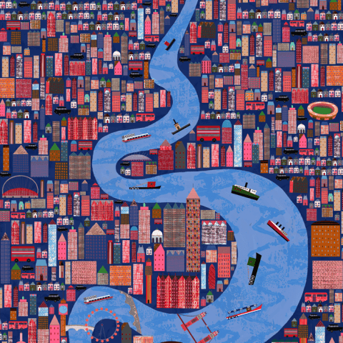 Her images are constructed in layers, rolling out backgrounds with printing inks, onto which she creates more layers. Stencils, intricately cut and mono printed papers, collage, acrylic washes, painted details and drawing are all part of the process. Some of her images are created entirely in Photoshop, others are created entirely by hand.