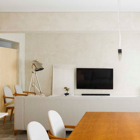 The common areas are open and fluid, with the furniture helping to define their function. The concrete pillars and beams were left visible and became part of the spatiality of the apartment. A hybrid, semi-open room may be used as a study. Next to it, there is a toilet and laundry room. A new hierarchy was created in the bedroom area, with one small bedroom (with a disproportionately sized pillar), a medium-sized room (which could be en-suite, as the toilet has two doors), and a master suite. The suite, which occupies the area where the living room was previously located, is divided into three areas: bed, closet and bathroom. A concrete beam runs the full length of the room, bringing natural light to the suite.