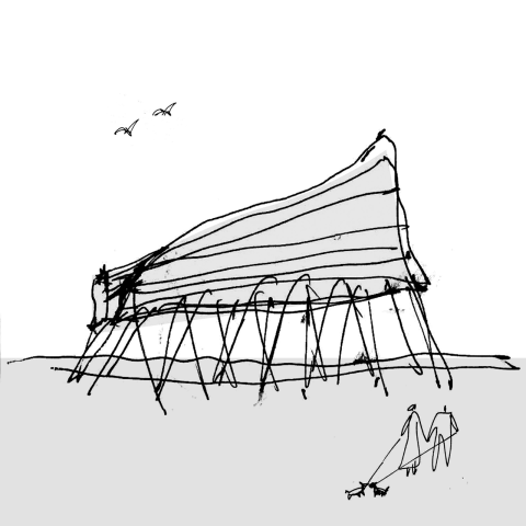 Conflating the form of an overturned ship and a typical suburban house, SuralArk will provide shelter for respite and contemplation for thousands of park visitors this spring and summer. The large-scale installation - part ship, part house – will span more than 50 feet with an elevation of 16 feet. Representative of the increasingly blurred lines between city, suburban environments, and rural living, Austin+Mergold’s SuralArk will be covered by a patchwork of vinyl siding – a typical material often used on nearby Queens residences. At Socrates, SuralArk will be light permeable and emit a warm glow as the sun bleeds through its surface. The upturned ark echoes the park’s past while considering the future, as a possible escape from rising tides that submerged the park in October 2012 during Super Storm Sandy.