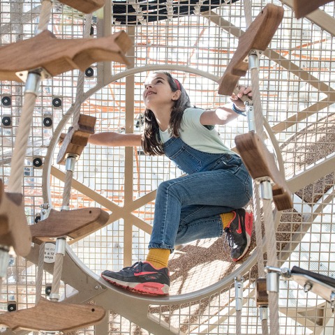 The spatial configuration is associated with the anatomy of the whale: The mouth is a large ship with a dense pattern of hammocks at different heights. Hammocks are orange, like krill, which is one of the main foods of whales. Next to it, the brain is a large vertical labyrinth, space to cross to reach the slides, which in turn function as the spine.