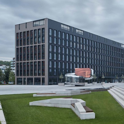 The design of public space between buildings has become a separate important topic for the authors. Landscape architect Martin Barry is the co-author of the overall concept of the layout of the terrain and paved outdoor areas. The basic geometry is divided in the design and breaks down into individual lines, elements, materials. The overall composition is horizontally and vertically divided into individual wide sidewalks along the buildings, connected by a ramp and stairs, near the central square there are two fountains. The landscape is separated from the paved areas by retaining walls. There are atypical sculptural benches for sitting on the grassy area. The wild character of the greenery, referring to the industrial history of the place, was created in close collaboration of the authors with the landscape architect Jana Pyšková.