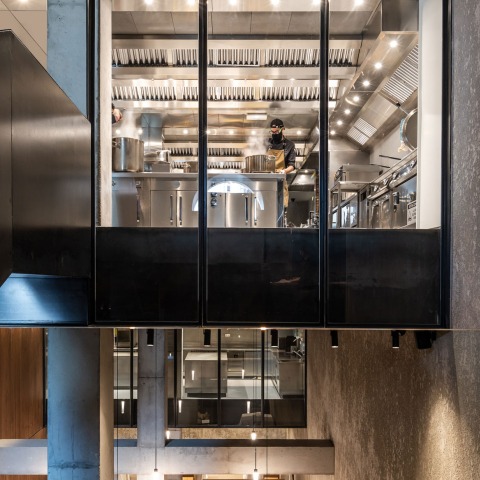 The site is a 20x20m square with three floors, where the inherited structure has an important presence and hierarchy. At the same time, each floor has been organized in three parts so that the central one is occupied by a big walnut box where each of its ‘strata’ is revealed by the change on its surface’s modulation. This central heart accommodates bathrooms and sculleries, and distinguishes from the spaces located in both sides, that are home to the dining areas of each gastronomic proposal. Over them, and in a constant visual contact with the city, the kitchens and the ‘chef’s table’ light up the dining areas at night. This location encourages cross views between dinner guests, chefs and pedestrians, besides the fact that saves a privileged setting for the staff, those who spend more time in the restaurant.