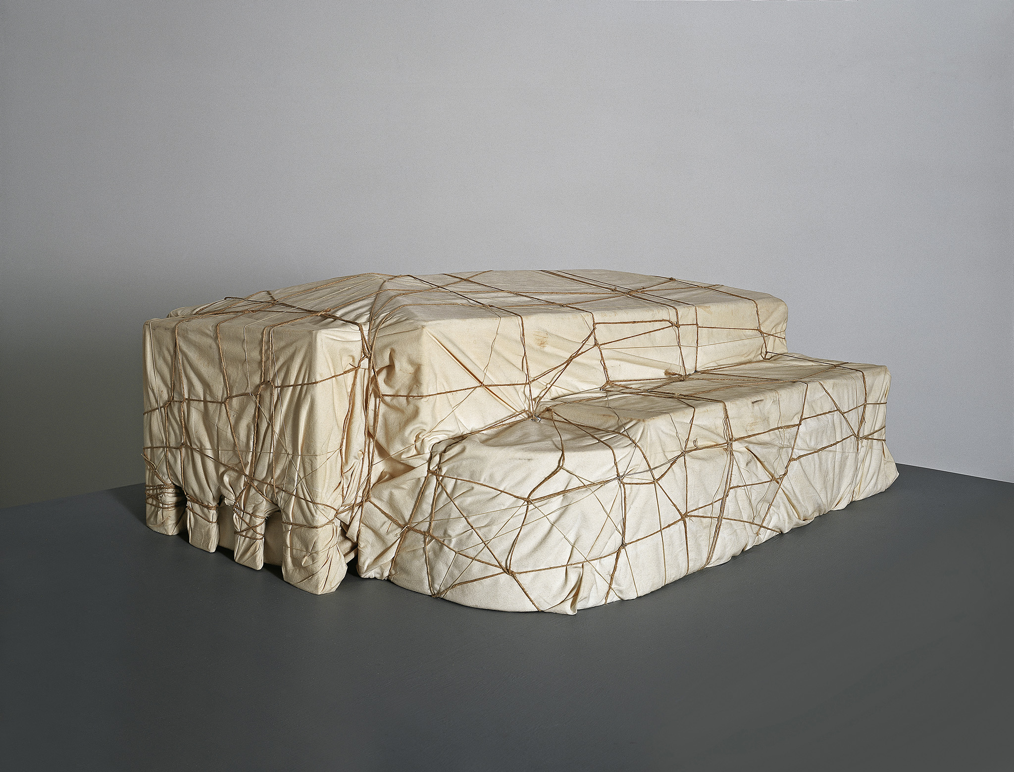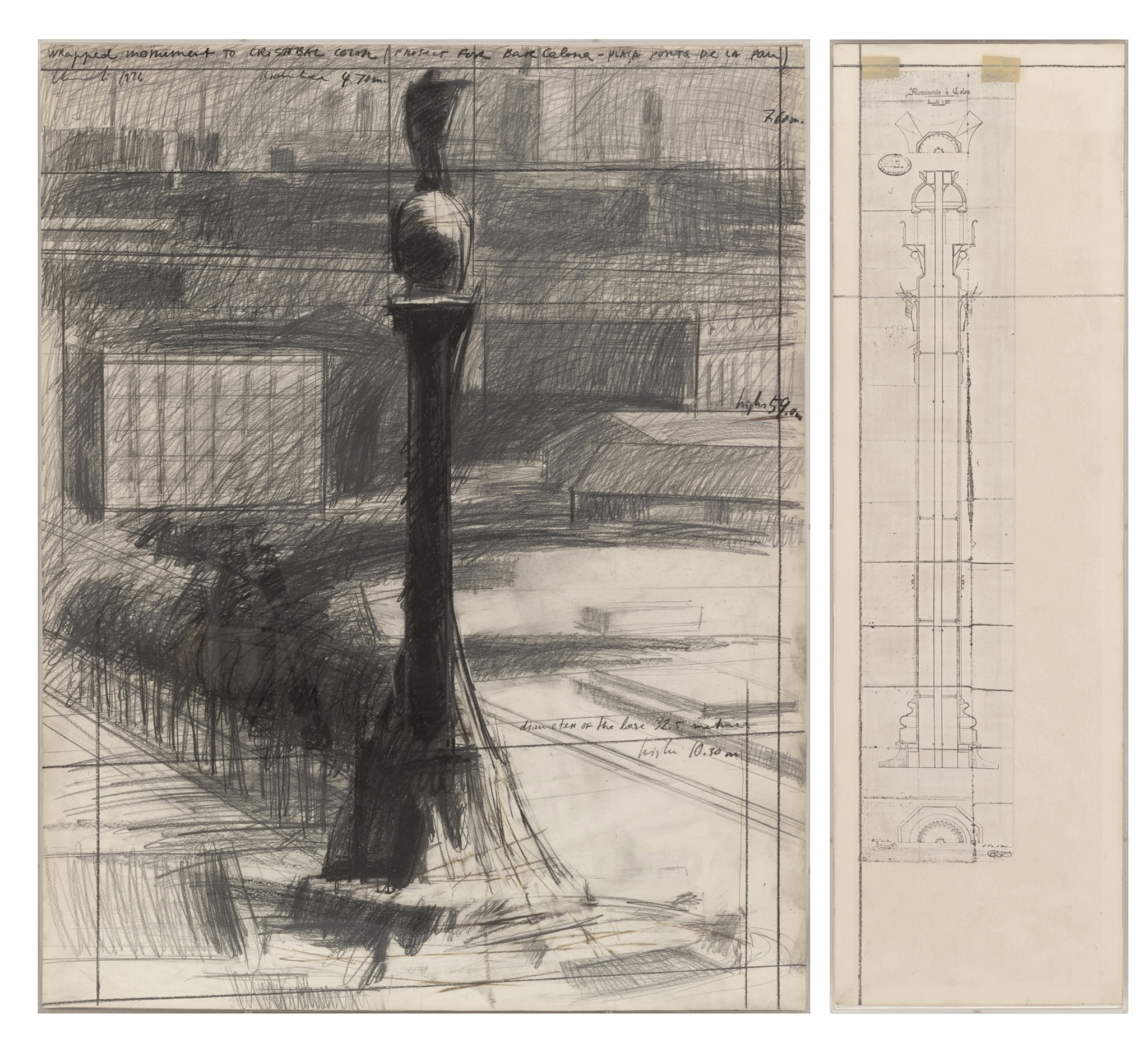 Christo and Jeanne-Claude. Wrapped monument to Cristobal Colon (Project for Barcelona-Passeig de Colom, Plaça Porta de la Pau), 1975. Graphite, charcoal, cardboard, fabric, and thread on paper. 72 × 56.5 × 4 cm (28 ⅜ × 22 ¼ × 1 ⅝ inches) (framed). Courtesy by Christo and Jeanne-Claude Foundation / Prats Nogueras Blanchard Barcelona/Madrid.