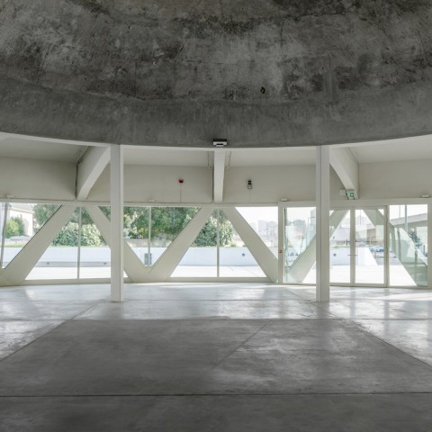With its different uses, the dome and pillars had been covered with false ceilings and wrapped by aluminium panels, and the space was compartmentalized with partitions. The intervention returns the building to its original silhouette, revealing its 7.3-meter high dome and interesting pillar structure, enhancing the open character of the gallery through a panoramic glass façade. A new concrete pavement was made to accentuate the materiality of the building and a previously added annex was eliminated. The final result creates dynamic spaces that complement the project spatially and programmatically.