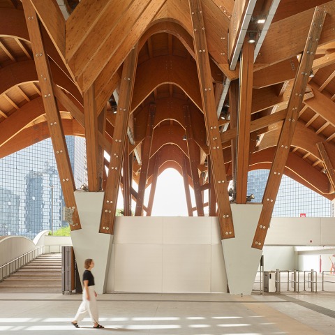 The station, designed by Tagliabue – EMBT Architects, is built over the existing metro lines, replacing a previous building, and uses wood as its primary construction material. Its organic form contrasts with the original 1970s design for the complex, by Kenzo Tange.